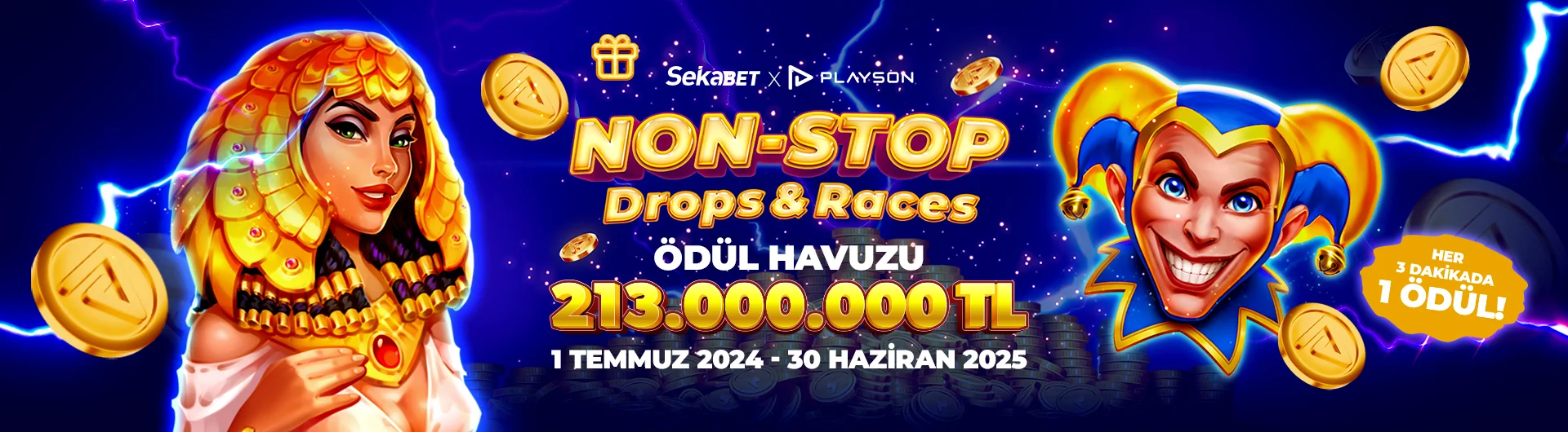 ✩ Playson Non-Stop Drops & Races slot etkinliğinde 1 yıl boyunca her ay üçer etkinlik olarak gerçekleşecektir.